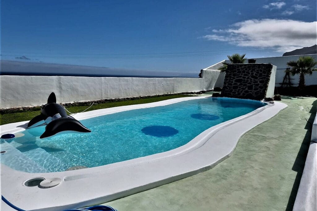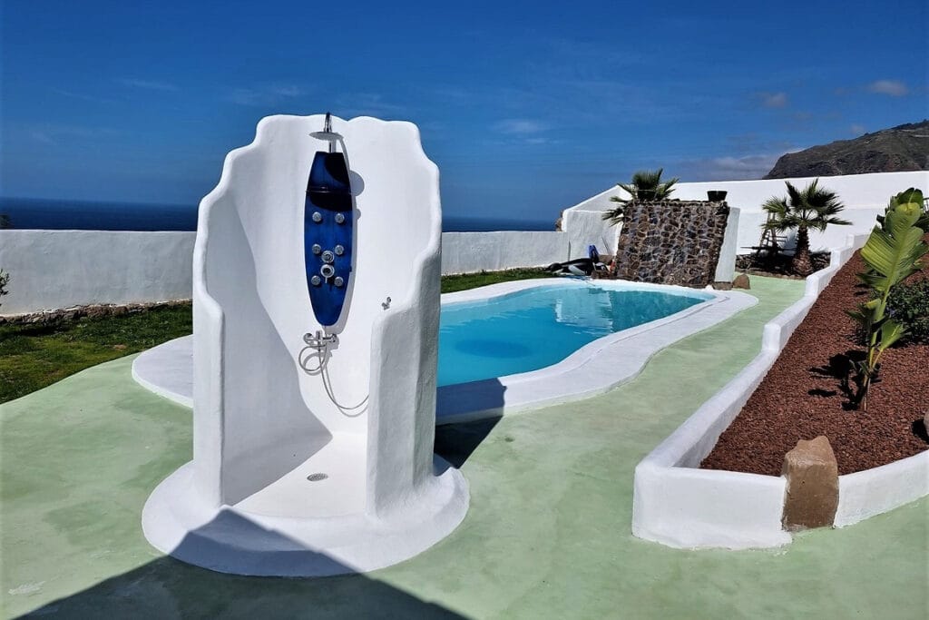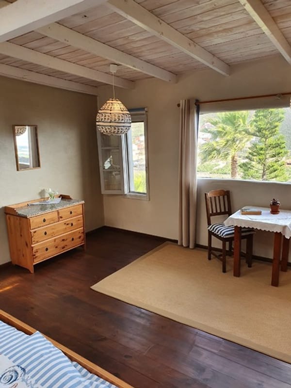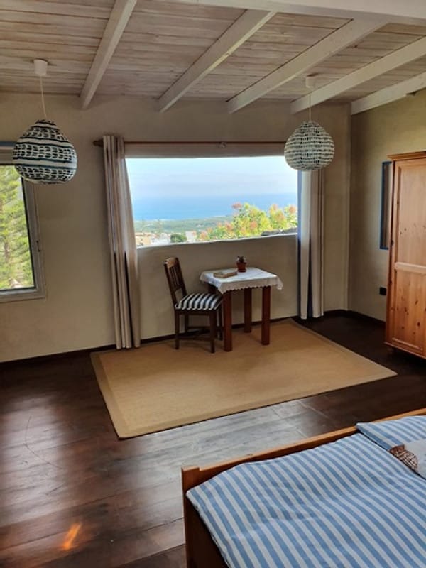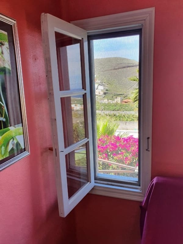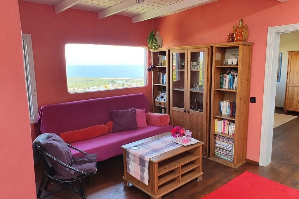 Von der Vorderseite hat man einen tollen Blick über Bananenplantagen bis zum Meer, das Ganze aus Panoramafenstern von allen Räumen aus. Das Ferienhaus liegt auf einer Höhe von knapp 150 Meter über dem Atlantik. Überall sind Dachfenster, bei Nacht kann man sogar vom Bett aus die Sterne zählen…