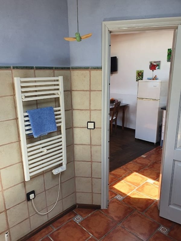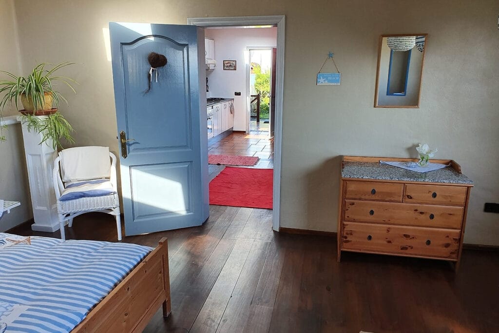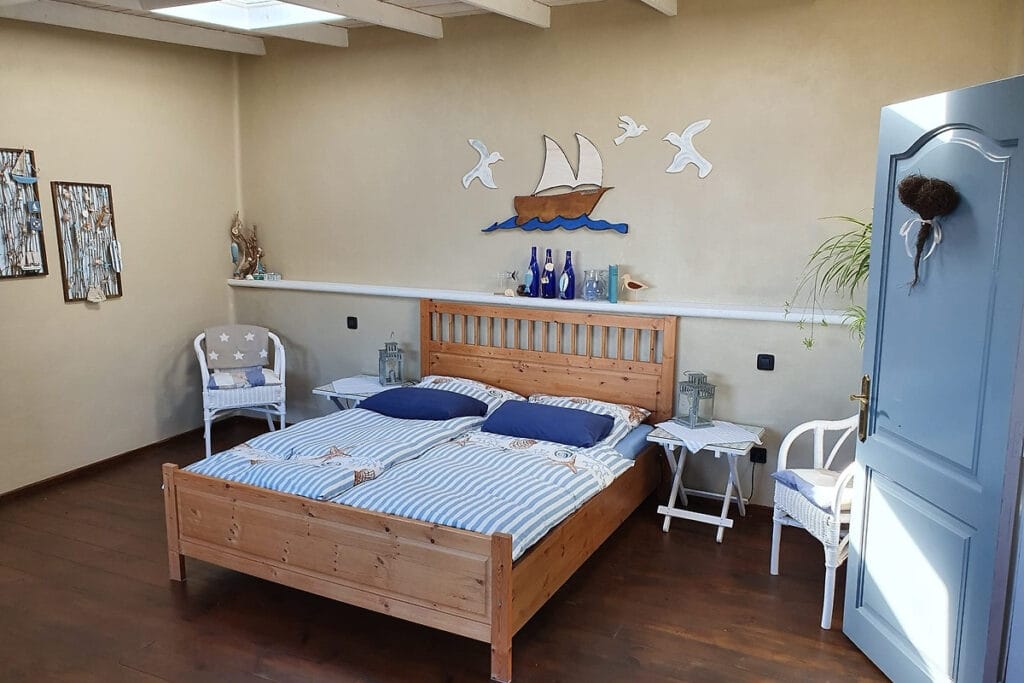 Die Wohnung verfügt über ein großes Schlafzimmer mit einem französischen Doppelbett von 1,60m x 2 m. Die Räumlichkeiten sind mit Holzdielen und Dachfenstern ausgestattet. Platz für ein Kinderbett ist ebenfalls, dies steht auf Wunsch kostenlos zur Verfügung.