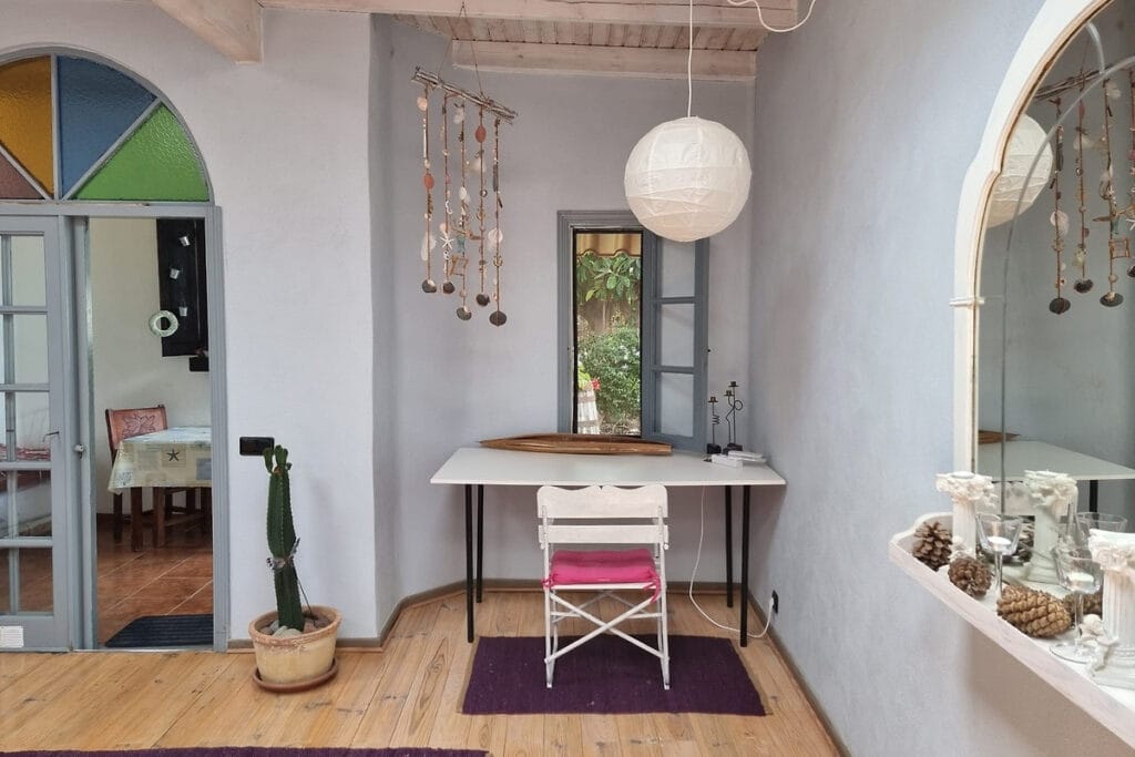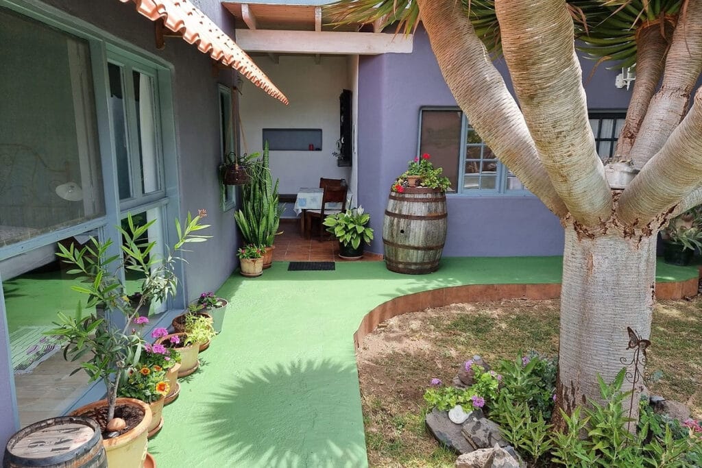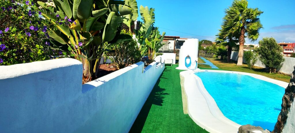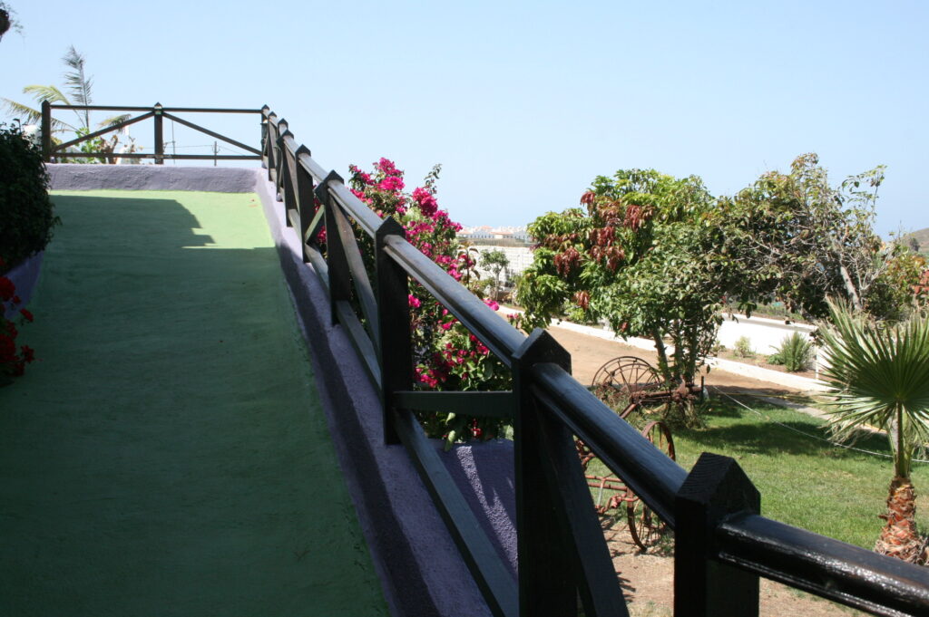 Im abgeschlossenen Garten befindet sich ein gemütlicher erhöhter Sitzplatz unter einem großen Gummibaum mit Meerblick. Auch ein überdachter Außenplatz mit Tisch und Stühlen lädt zum Verweilen ein, wenn es im Sommer mal heiß ist. Der Garten hat eine Größe von ca. 100qm, davon ist eine große Fläche mit Rasen zum Relaxen.