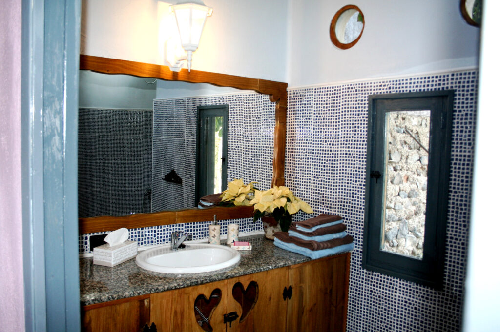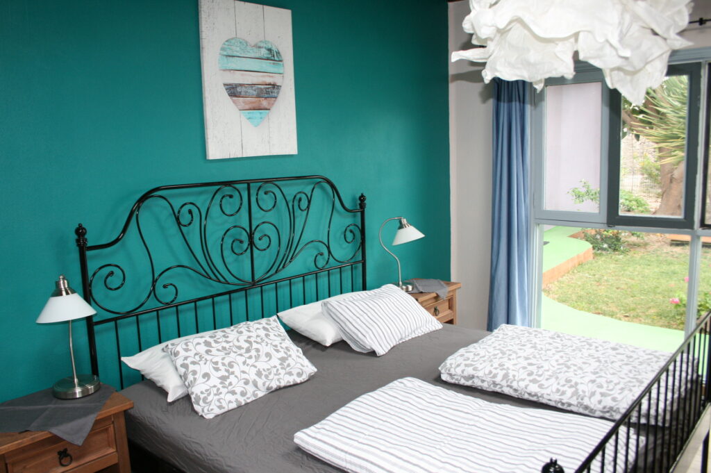 Durch den Garten getrennt befindet sich ein zweites Schlafzimmer, dies hat eine Fläche von ca. 18qm.Das Doppelbett ist 1,50 x 1,90m groß. Im Bad befindet sich eine XXL- Dusche, eine Toilette und ein Waschtisch mit großem Spiegel und einem Fenster nach draußen. Im Schlafzimmer ist außerdem ein kleiner Tisch mit Blick in den Garten.