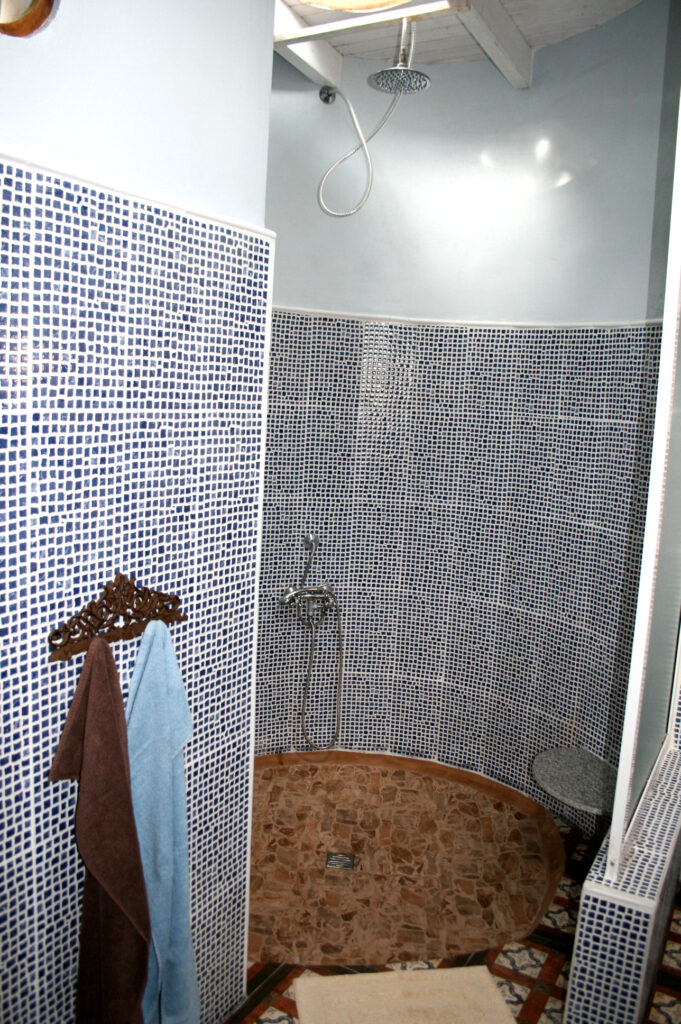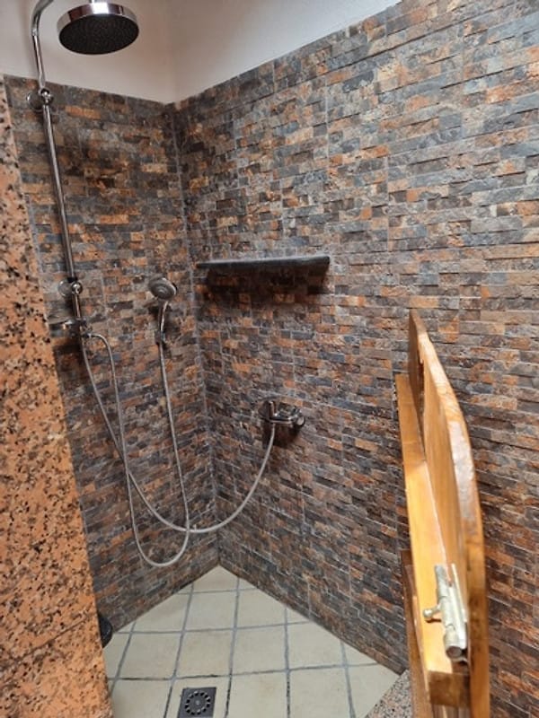 Das Bad verfügt über eine große Dusche, einen XXL- Spiegel und genügend Abstellfläche für Utensilien. Die Toilette ist separat.