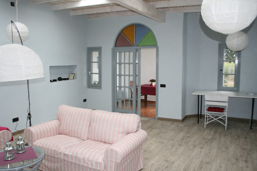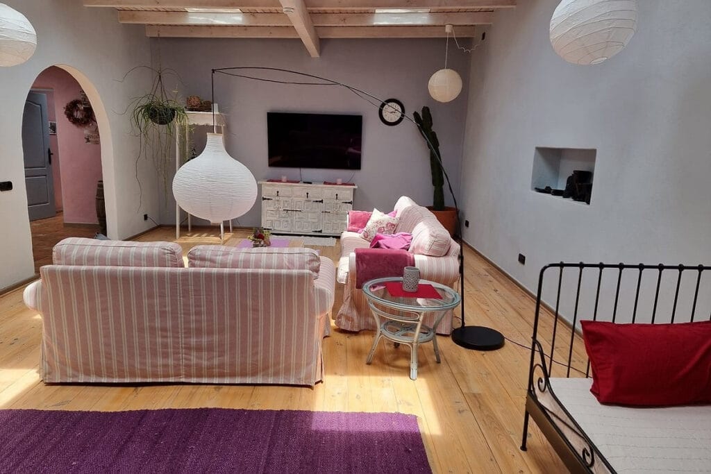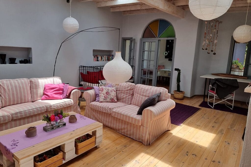 Das Wohnzimmer ist mit einem Zwei-und einem Dreisitzersofa ausgestattet und einem großen Couchtisch. Außerdem einem Arbeitstisch. Ein kostenloser Highspeed-Internetanschluss ist inbegriffen. Auch ein extra Bett steht zur Verfügung. Für eine dritte Person werden 15 Euro pro Nacht berechnet.