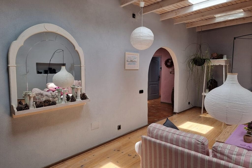 In der ganzen Wohnung sind Dachfenster, so dass alles hell und einladend aussieht.