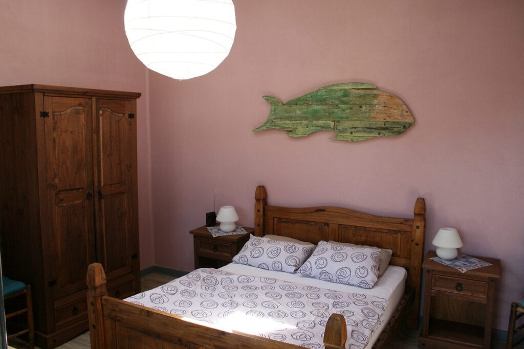 Im Schlafzimmer befindet sich ein bequemes Bett mit einer Größe von 1,80 x 2m, ein Kleiderschrank und eine Kommode, außerdem 2 Korbstühle. Platz für ein Kinderbett ist auch vorhanden, dies steht auf Wunsch kostenfrei zur Verfügung. Vom großen Fenster aus blickt man in den Garten.